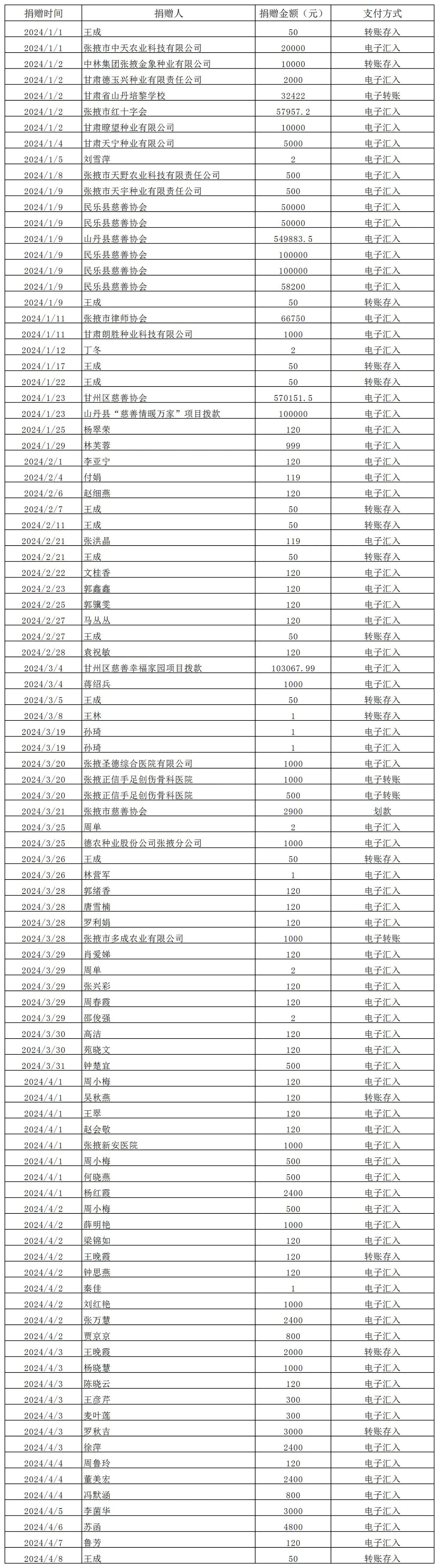 2024年張掖市慈善協(xié)會(huì)積極搭建愛(ài)心平臺(tái),得到廣大愛(ài)心人士和愛(ài)心單位積極響應(yīng),踴躍捐款捐物,現(xiàn)將(2024年1月1日--4月8日)接收到的銀行轉(zhuǎn)賬收入公示如下:
