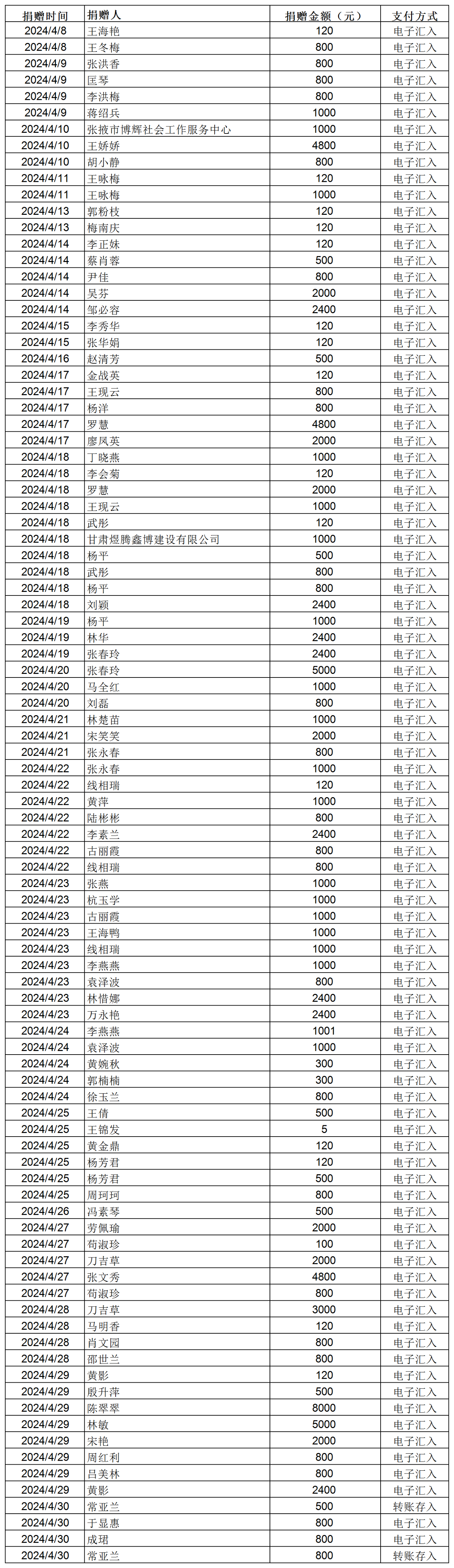 2024年張掖市慈善協(xié)會積極搭建愛心平臺,得到廣大愛心人士和愛心單位積極響應(yīng),踴躍捐款捐物,現(xiàn)將(2024年4月8日--4月30日)接收到的銀行轉(zhuǎn)賬收入公示如下: